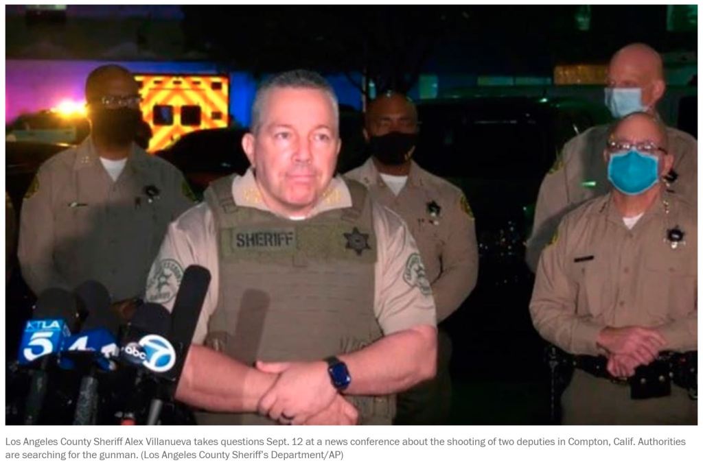 After the shooting, Sheriff Alex Villanueva said that critics of police need to “stop fanning the flames of hatred.” Officials have not identified a potential suspect or motive in the attack.