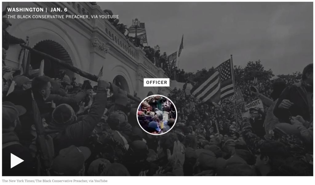 Today the New York Times published a visual investigation titled, ” ‘They Got a Officer!’: How a Mob Dragged and Beat Police at the Capitol.” The article describes how two cops were mobbed by Trump’s insurrectionists, dragged into the crowd, punched and beaten with clubs, hockey sticks, police shields, and flag poles.