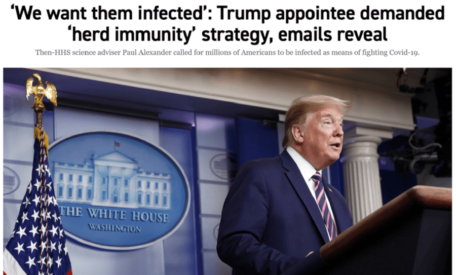 “There is no other way, we need to establish herd, and it only comes about allowing the non-high risk groups expose themselves to the virus. PERIOD,” then-science adviser Paul Alexander wrote on July 4 to his boss, Health and Human Services assistant secretary for public affairs Michael Caputo, and six other senior officials.