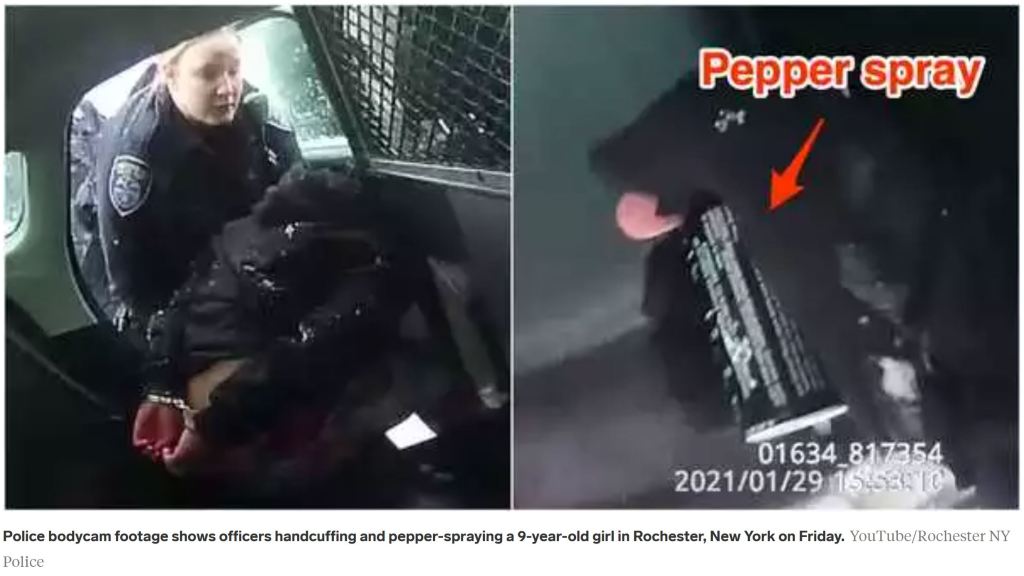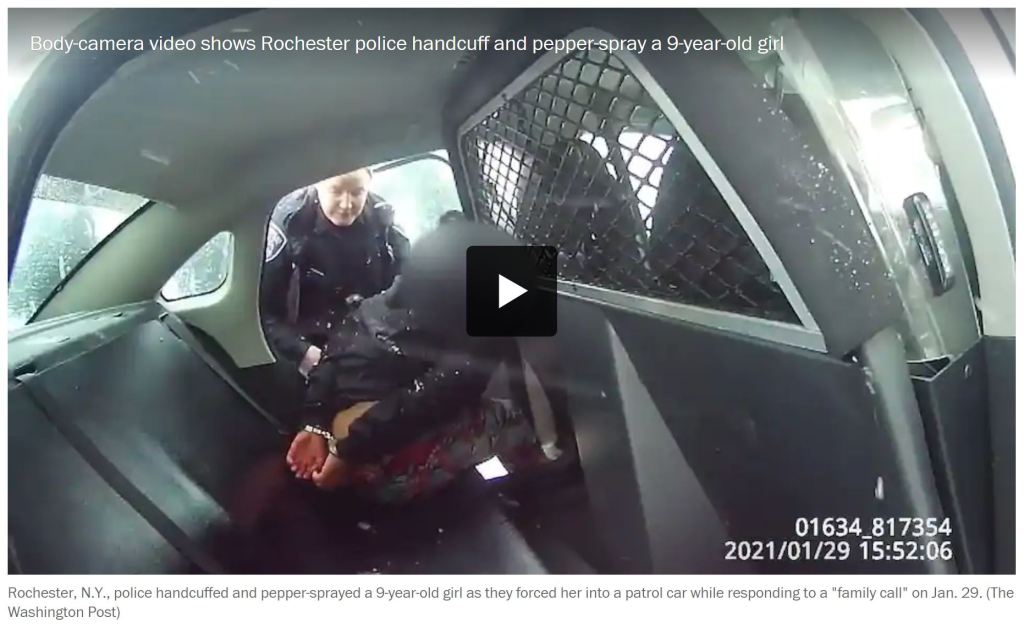 Handcuffed and sobbing, the 9-year-old girl screams “I want my dad!” repeatedly as Rochester, N.Y., police officers try to force her into a patrol car. When the girl keeps refusing to swing her legs inside, one officer pulls out his pepper spray.