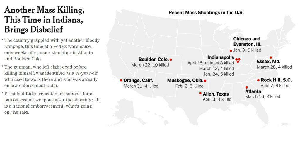 Sure am glad there’s no gun control. On April 17, 2021April 17, 2021 By subversivethinkerIn General I wouldn’t wanna miss a single one of these exciting events! Thank you, America. Source: The New York Times, April 16, 2021 Share this: Click to share on X (Opens in new window) X Click to share on Facebook (Opens in new window) Facebook Like Loading... Related