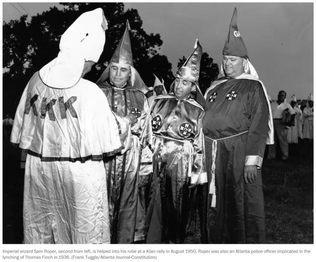 Imperial wizard Sam Roper, second from left, is helped into his robe at a Klan rally in August 1950. Roper was also an Atlanta police officer implicated in the lynching of Thomas Finch in 1936.