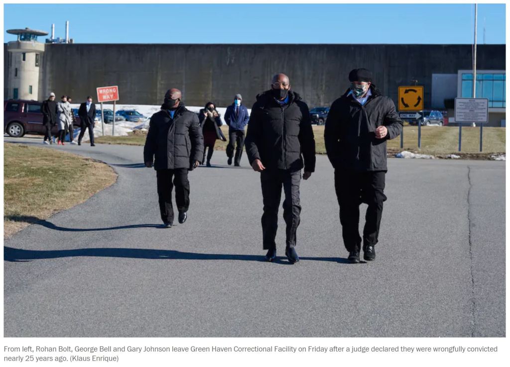 From left, Rohan Bolt, George Bell and Gary Johnson leave Green Haven Correctional Facility on Friday after a judge declared they were wrongfully convicted nearly 25 years ago. (Klaus Enrique)