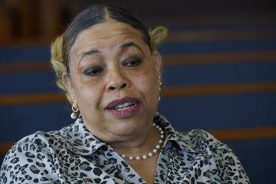 Carolyn Roberts, daughter of Tulsa Race Massacre survivor Ernestine Alpha Gibbs, holds family photos of the Gibbs family business during an interview in Tulsa, Okla., on Sunday, April 11, 2021. (AP Photo/Sue Ogrocki)