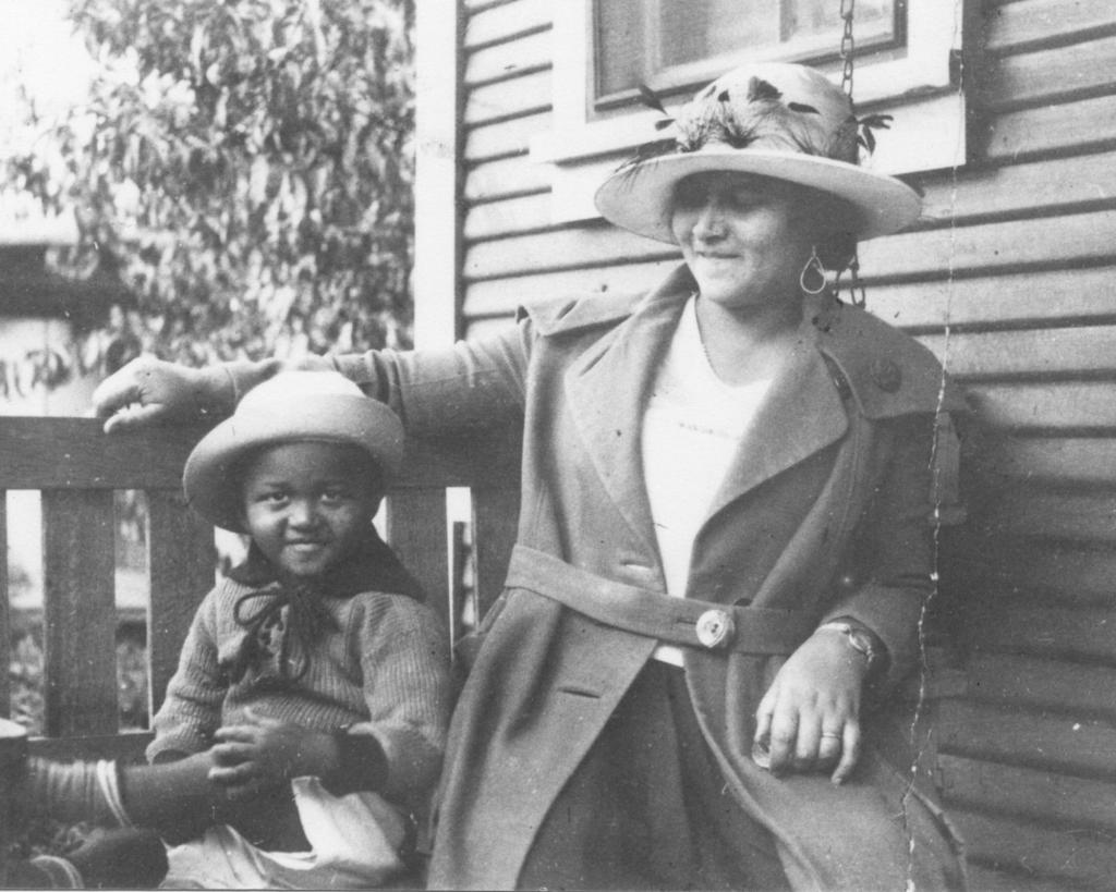 This photo provided by the Department of Special Collections, McFarlin Library, The University of Tulsa shows an African American woman and girl sitting on a porch swing, both dressed in coats and hats, by the side of a house. Provenance is unknown; however, it is believed that these photos were taken in Tulsa, Okla. prior to the Tulsa Race Massacre. (Department of Special Collections, McFarlin Library, The University of Tulsa via AP)