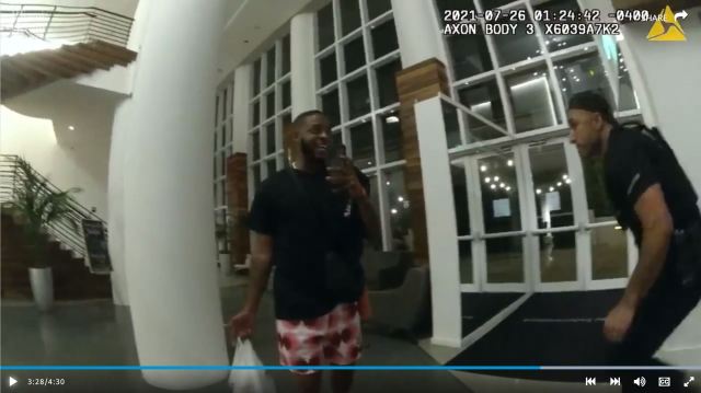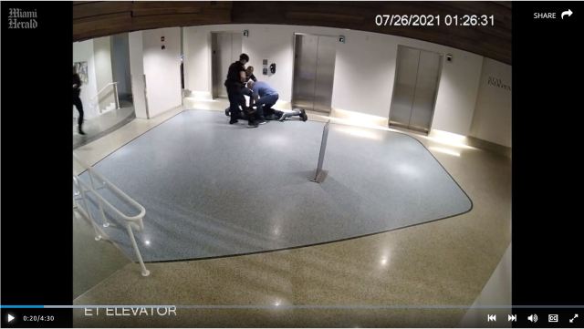 Here’s the story: a guy drives his motor bike recklessly, and knocks a cop off of his bike. An entire herd of cops give chase. The video picks up as the lone suspect runs into a hotel lobby and is immediately apprehended by the first cop following him in. The suspect complies with the cop’s orders and lays down on the floor, prone on his stomach, hands behind his back.