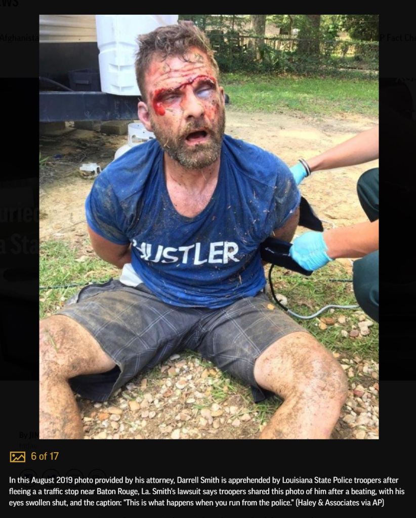 In another case from August 2019, Darrell Smith, a white motorist who fled a traffic stop near Baton Rouge, contended in a lawsuit that troopers caught up with him and beat him beyond recognition, causing him to be hospitalized with temporary kidney failure. A use-of-force report leaves unchecked whether body-camera video exists and lists Smith’s injuries as “nonincapacitating.” Smith’s lawsuit says troopers shared a photo of him after the beating with his eyes swollen shut and the caption: “This is what happens when you run from the police.”